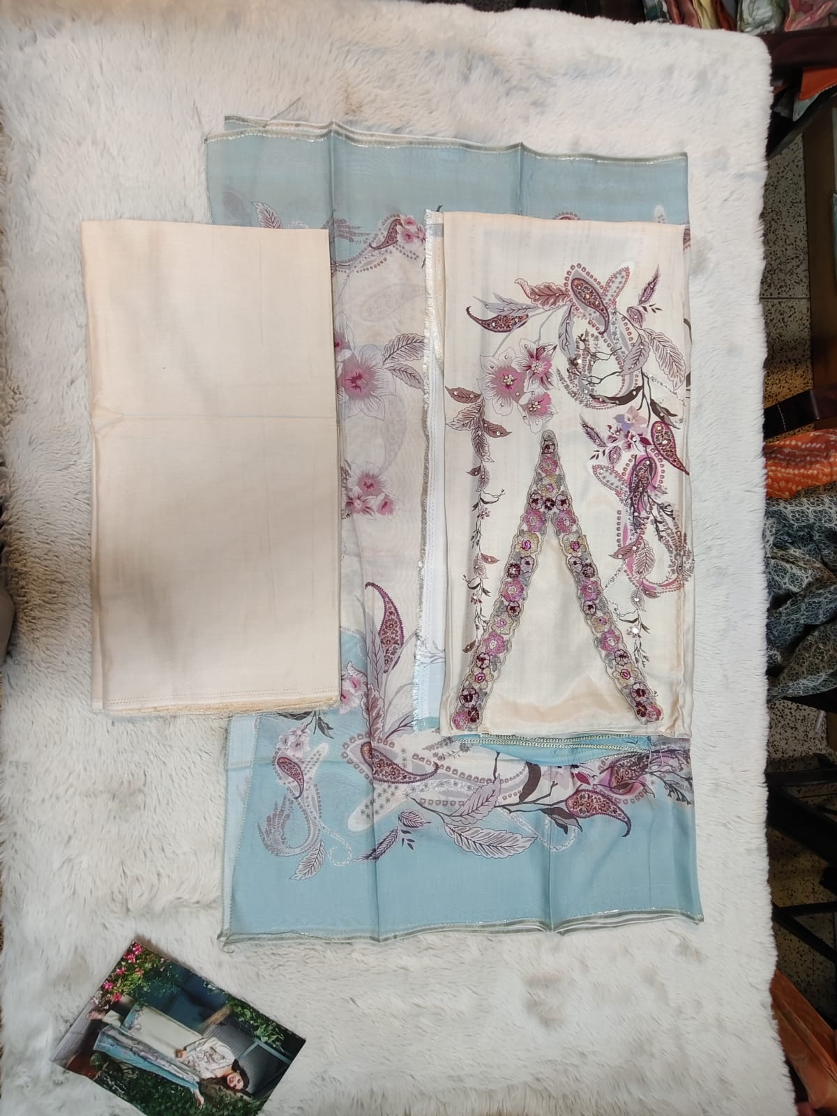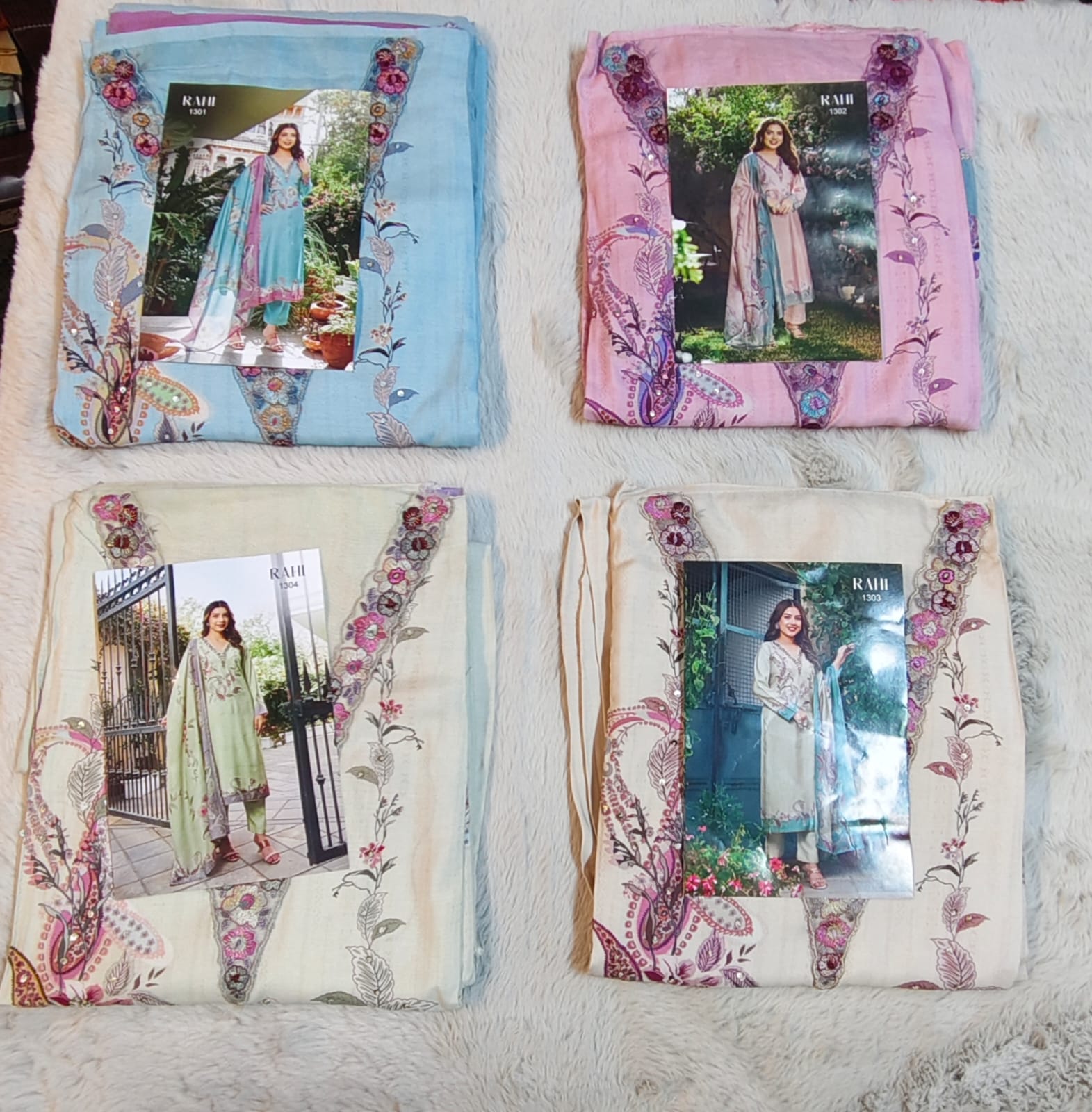 👚Top: Muslin Digital Printed Heavy Embroidery V Neck Patch Stich Heavy Handwork On Tai Works 🔻Designs: 4 Pcs |